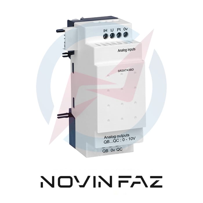 ماژول آنالوگ اشنایدر با کد فنی SR3XT43BD دارای 2 ورودی و 2 خروجی است. خروجی آنالوگ این تجهیز از 0 تا 10 ولت و حداکثر جریان بار آن 10 میلی آمپر است. رنج رزولوشن برای ورودی و خروجی 10 بیت است. اتصالات آن توسط ترمینال پیچی انجام میشود. درجه حفاظت این قطعه برابر با IP20 و IP40 است و 110 گرم وزن دارد.