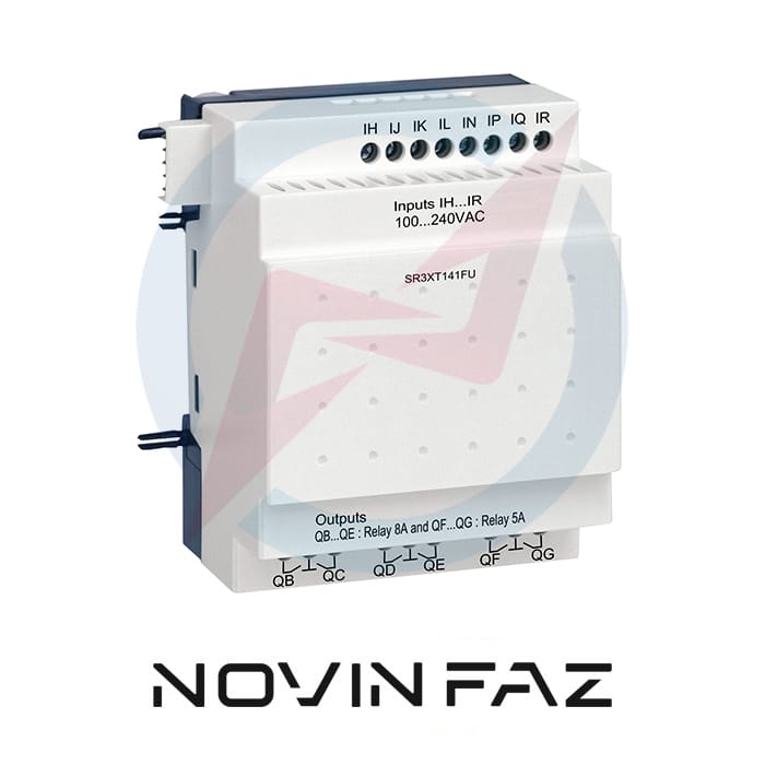 ماژول 14 ورودی-خروجی دیجیتال اشنایدر با کد فنی SR3XT141FU سری Zelio Logic SR3 با ولتاژ 100 تا 240 ولت AC تغذیه میشود. این قطعه دارای 8 ورودی و 6 خروجی است و اتصالات آن توسط ترمینال پیچی انجام میشود. این ماژول با برنامه Ladder قابل برنامهریزی و بهره برداری است که برای افراد تازه کار نیز انتخاب خوبی است.
